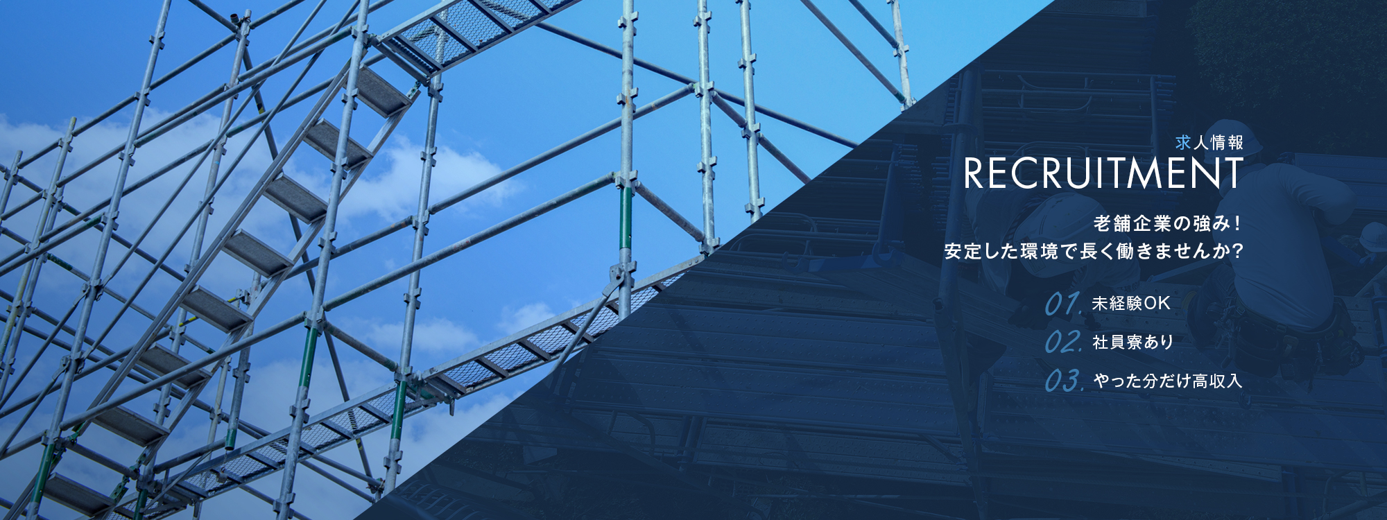 当社は昭和42年創業の歴史ある企業だと自負しております。足場工事のノウハウはもちろん培ってきた伝統や職人としてのあるべき姿、働きやすい環境など他社とは違う待遇にて成長していけると思います。